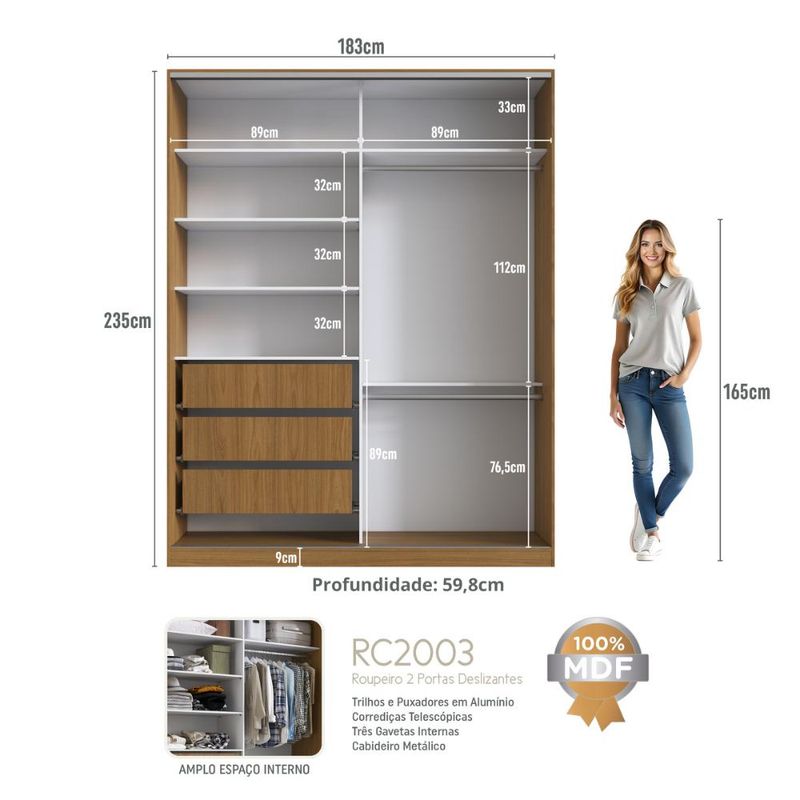 Guarda Roupa Solteiro Freijó Natural Branco 183x59,8x235cm REF: 7898463868441