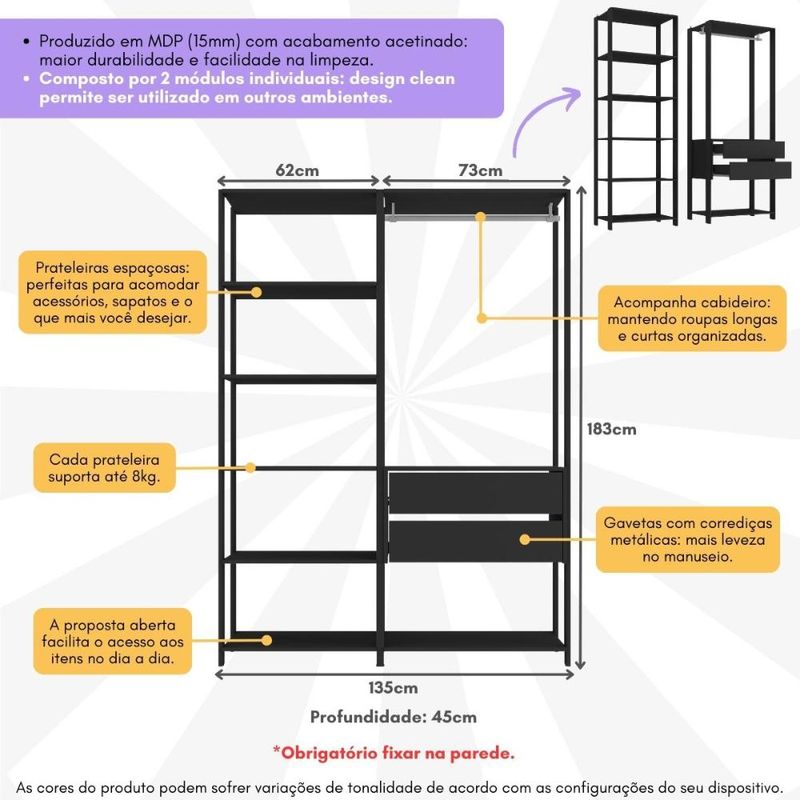 Casa e DecoraçãoMóveisGuarda-roupa e roupeirosGuarda-Roupas Closet Modulado 135cm 2 Peças com 2 Gavetas e Cabideiro Multimóveis MP4320