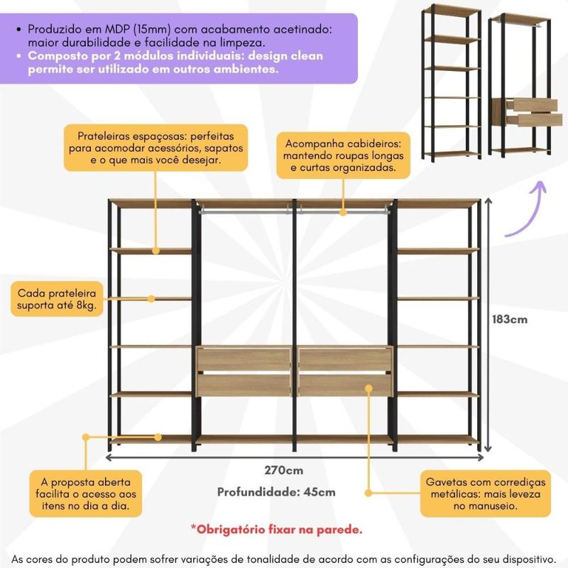 Casa e DecoraçãoMóveisGuarda-roupa e roupeirosGuarda-Roupas Closet Modulado 270cm 4 Peças com 4 Gavetas e Cabideiros Multimóveis MP4321