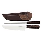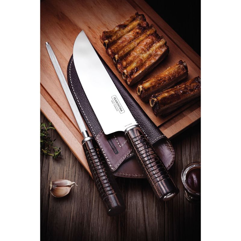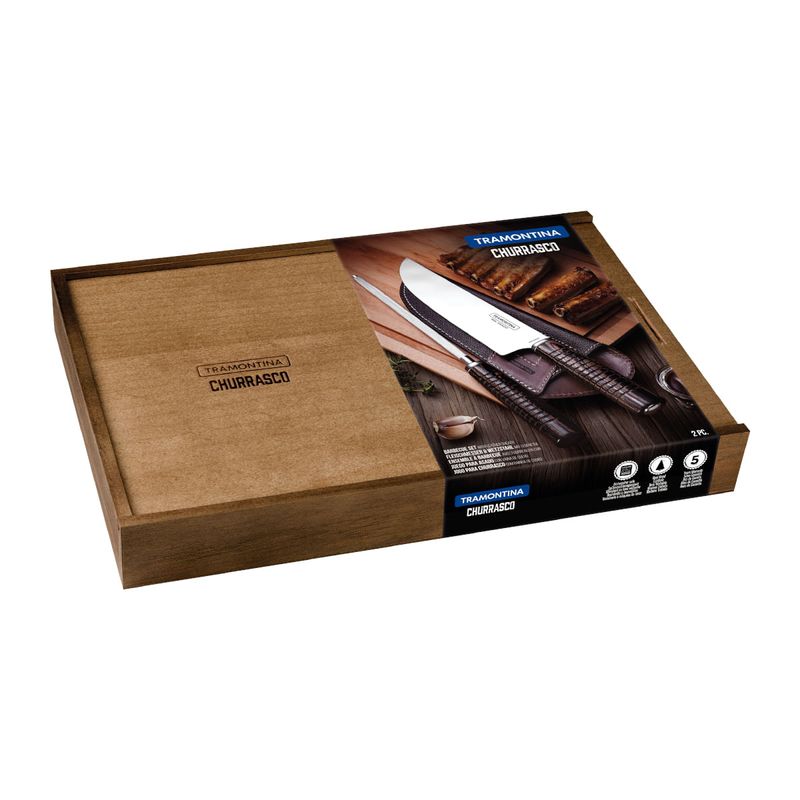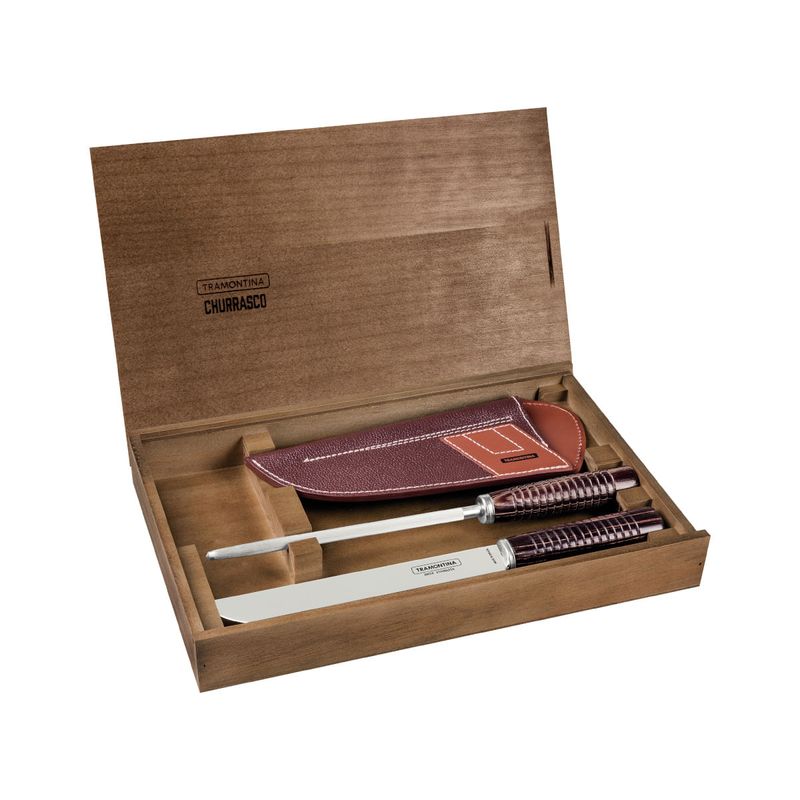 Jogo para Churrasco Tramontina Aço Inox Cabos em Madeira Polywood Castanho Bainha de Couro e Estojo de Madeira 2 Peças REF: 7891112246706