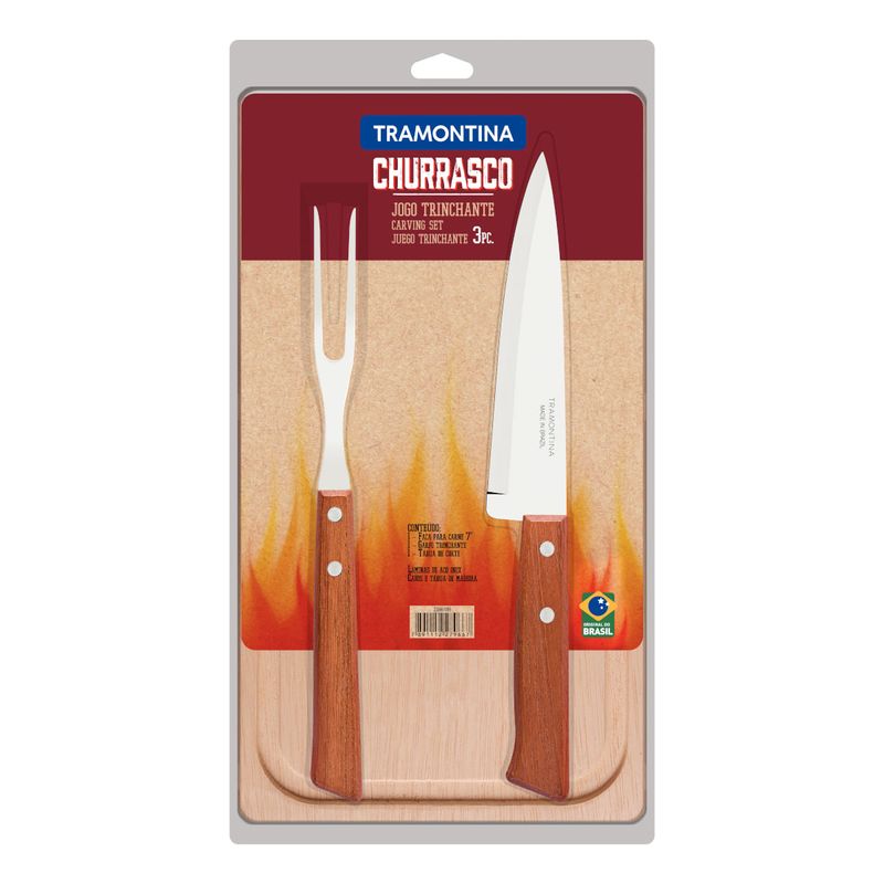 Casa e DecoraçãoUtilidades DomésticasUtensílios de ChurrascoJogo Trinchante Churrasco Tramontina Aço Inox e Cabos de Madeira Natural 3 Peças
