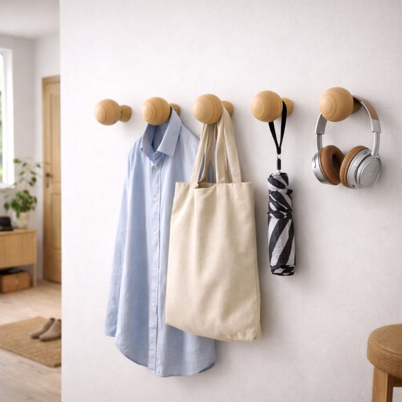 Kit 5 Ganchos Cabideiros de Parede Esfera em Madeira Maciça Pinus Cor Natural REF: 7898775145254