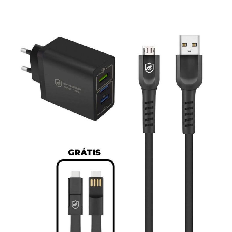 Eletrônicos e TecnologiaTelefoniaAcessóriosKit Carregador Triplo Turbo + Cabo Dual Shock Micro USB V8 + Cabo 3 em 1 - Gshield