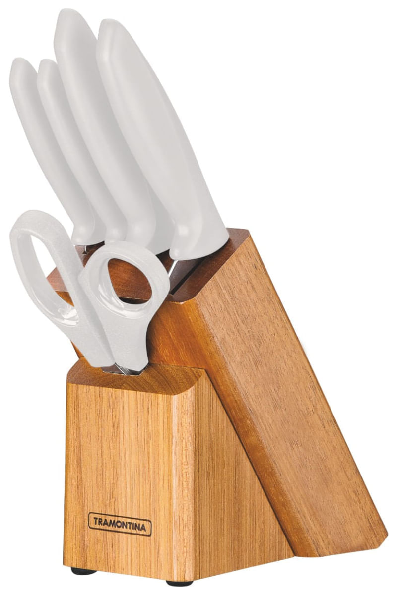 Casa e DecoraçãoUtilidades DomésticasAcessórios de CozinhaKit com facas brancas e tesoura com suporte de madeira linha Plenus Tramontina