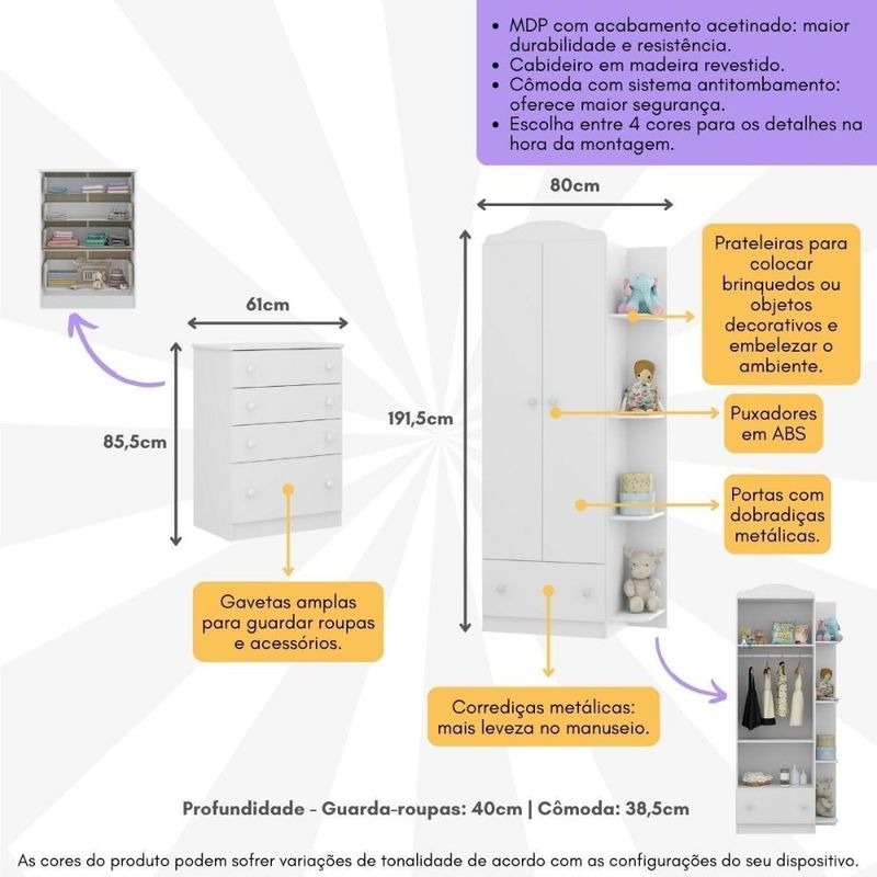 Casa e DecoraçãoMóveisGuarda-roupa e roupeirosKit Guarda-Roupas Infantil 2 Portas 1 Gaveta e Cômoda 4 Gavetas João e Maria Multimóveis MP4210