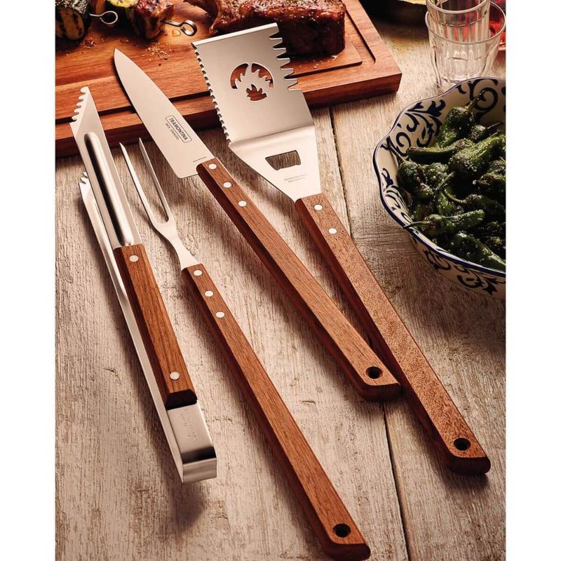 Casa e DecoraçãoUtilidades DomésticasUtensílios de ChurrascoKit Pegador de Carne Churrasco Inox Madeira e Pedra Amolar Facas Dupla Face 400/1000
