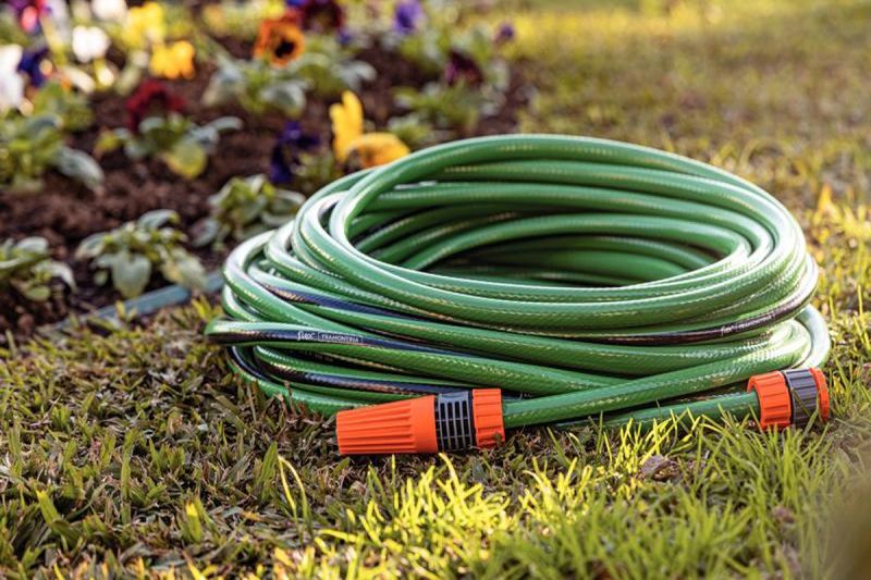 Mangueira Flex Para Jardim Tramontina em PVC Verde com Faixa Preta 4 Camadas 10m Engate Rosqueado e Esguicho REF: 7891117105947
