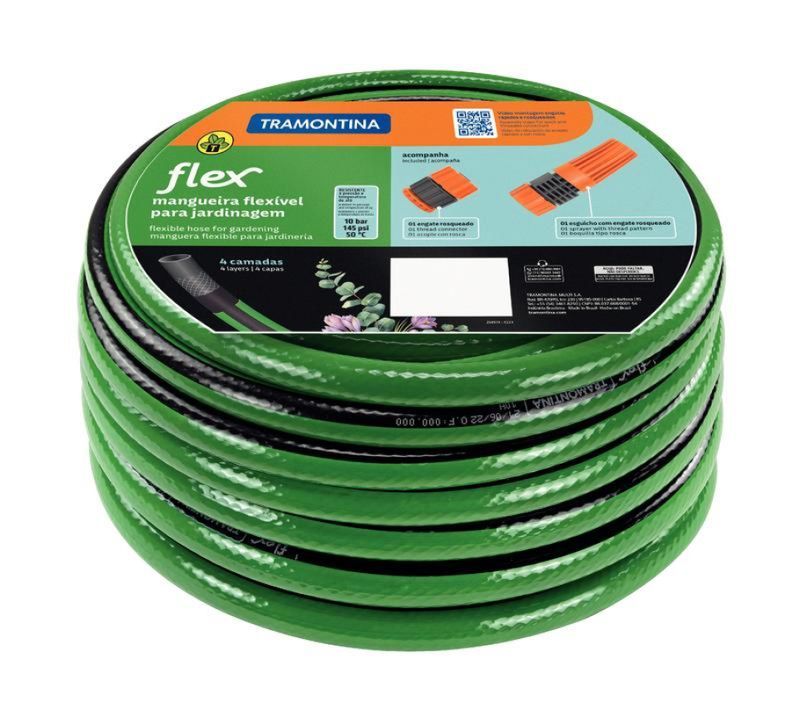 Mangueira Flex Para Jardim Tramontina em PVC Verde com Faixa Preta 4 Camadas 25m Engate Rosqueado e Esguicho REF: 7891117105961