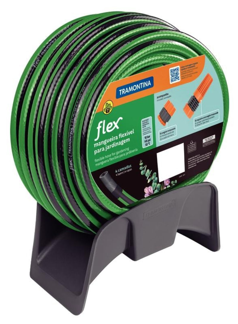 Mangueira Flex Tramontina em PVC Verde com Faixa Preta 4 Camadas 20m Engate Rosqueado, Esguicho e Suporte REF: 7891117105992