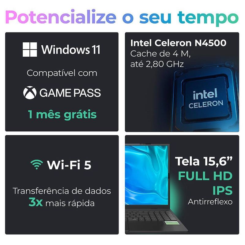 Eletrônicos e TecnologiaInformáticaNotebooksNotebook Positivo Intel Celeron N4500 4GB RAM 128GB eMMC 15.6 Windows 11 Vision C15M C4128B-15 Cinza
