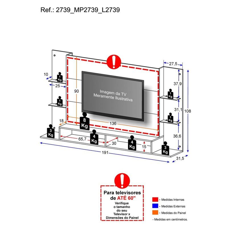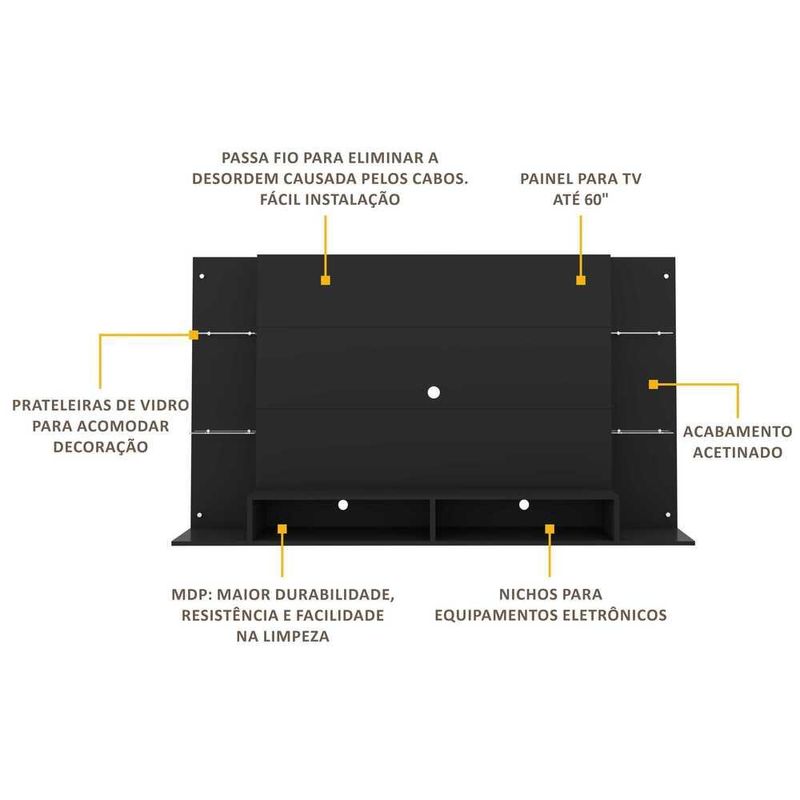 Casa e DecoraçãoMóveisRack e painel de TVPainel p/ TV 60" com prateleiras de vidro Braga Multimóveis