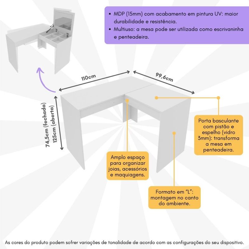 Casa e DecoraçãoMóveisPenteadeiraPenteadeira/Escrivaninha de Canto 110cm com Espelho Multimóveis CR25280