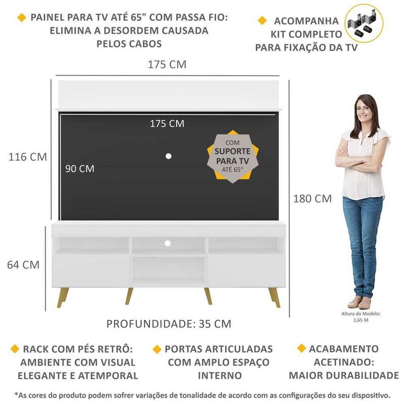 Casa e DecoraçãoMóveisRack e painel de TVRack com Painel e Suporte TV 65" Madri Multimóveis Branco/Preto com Prateleira e Pés Retrô Natural