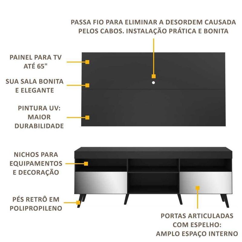 Casa e DecoraçãoMóveisRack e painel de TVRack com Painel Retrô com Espelho para TV até 65" Multimóveis Flórida FG3138 Preto