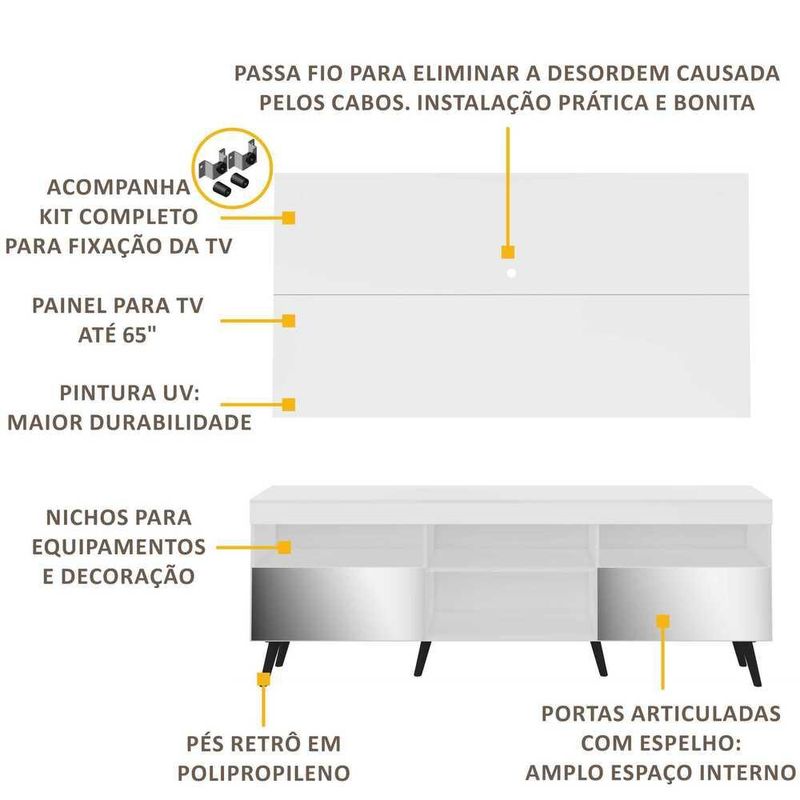 Casa e DecoraçãoMóveisRack e painel de TVRack Retrô com Espelho e Painel com Suporte para TV até 65" Multimóveis Flórida FG3142 Branco/Preto