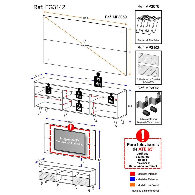 Rack Retrô com Espelho e Painel com Suporte para TV até 65" Multimóveis Flórida FG3142 Branco/Preto REF: 578684_Sicredi
