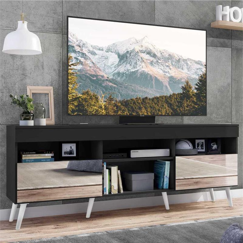 Casa e DecoraçãoMóveisRack e painel de TVRack TV 65" com Espelho, Pés Retrô e 2 Portas Paris Multimóveis Preto/Branco