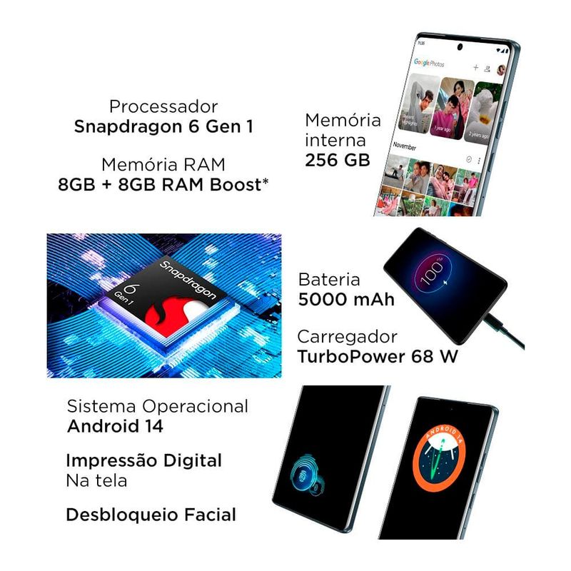 Eletrônicos e TecnologiaTelefoniaSmartphonesSmartphone Motorola Edge 50 Fusion 5G Blue Teal 256GB, Tela 6.7, 8GB RAM, Câmera com Moto AI, IP68 e Processador Snapdragon