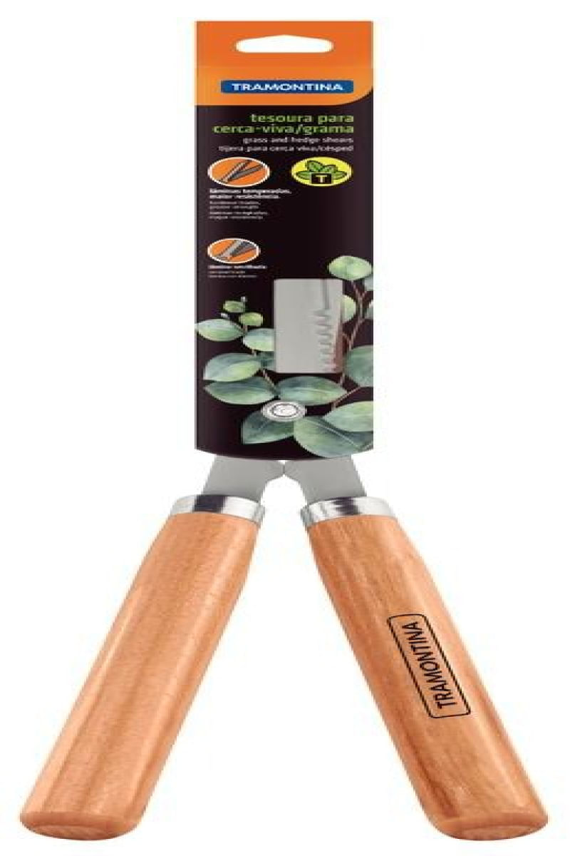 Tesoura Para Cerca Viva e Grama Tramontina com Lâmina Serrilhada e Cabo de Madeira REF: 7891117058090